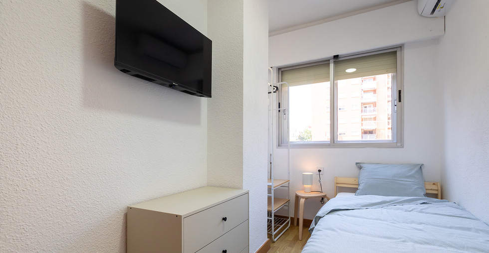 Cozy room available in a shared apartment in the Malvarosa. The apartment has a total of 5 rooms and shared spaces include a fully equipped kitchen, comfortable living room, and bright dining area. The room comes furnished with a desk and chair, ample storage space, and a comfortable bed.